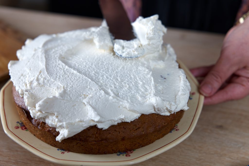 Une fois que les gâteaux ont atteint la température ambiante, utilisez un couteau à pain pour découper le dessus arrondi des biscuits afin qu’ils soient parfaitement plats. Placez le premier gâteau sur votre plat de service, déposez une généreuse louche de glaçage sur le dessus, puis étalez-le de manière à couvrir le gâteau uniformément en dépassant légèrement sur les bords. Renouvelez l’opération avec le deuxième gâteau.