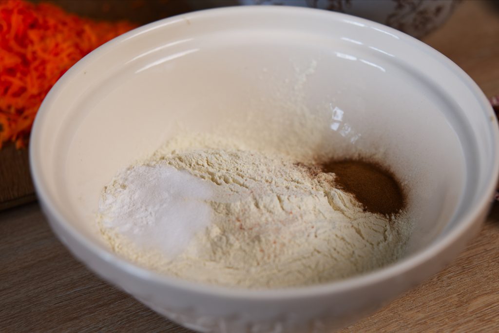 Dans un autre récipient, mélangez au fouet le reste des ingrédients secs (farine, cannelle, bicarbonate de soude, sel, levure chimique, noix de muscade et clous de girofle) jusqu’à ce que l’ensemble soit bien combiné. Incorporez progressivement ce mélange sec à la préparation aux œufs, et mélangez jusqu’à obtenir une pâte lisse. Ajoutez délicatement les carottes râpées à l’aide d’une spatule et les noix.