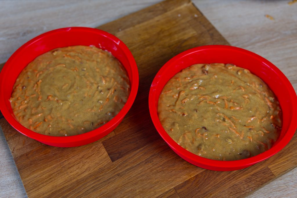 Enfourner deux moules de 20 cm simultanément présente un avantage majeur : la chaleur circule mieux autour de chaque gâteau. Contrairement à un moule unique très profond où le centre met une éternité à cuire (risquant d’assécher les bords), cette technique préserve tout le moelleux du carrot cake.